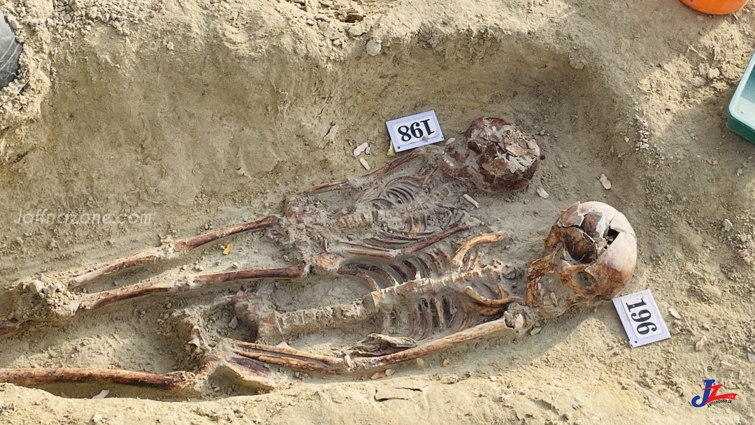 அதேவேளை , கடந்த நாட்களில் மேற்கொள்ளப்பட்ட அகழ்வு பணிகளின் போது, மூன்று சந்தர்ப்பங்களில் ஒன்றன் மேல் ஒன்றாக 06 எலும்பு கூட்டு தொகுதிகள் மீட்கப்பட்டுள்ள நிலையில் , தற்போது மேலும் இரு எலும்பு கூட்டு தொகுதிகள் ஒன்றுடன் ஒன்று தொடுகையுற்ற நிலையில் மீட்கப்பட்டுள்ளமை குறிப்பிடத்தக்கது
