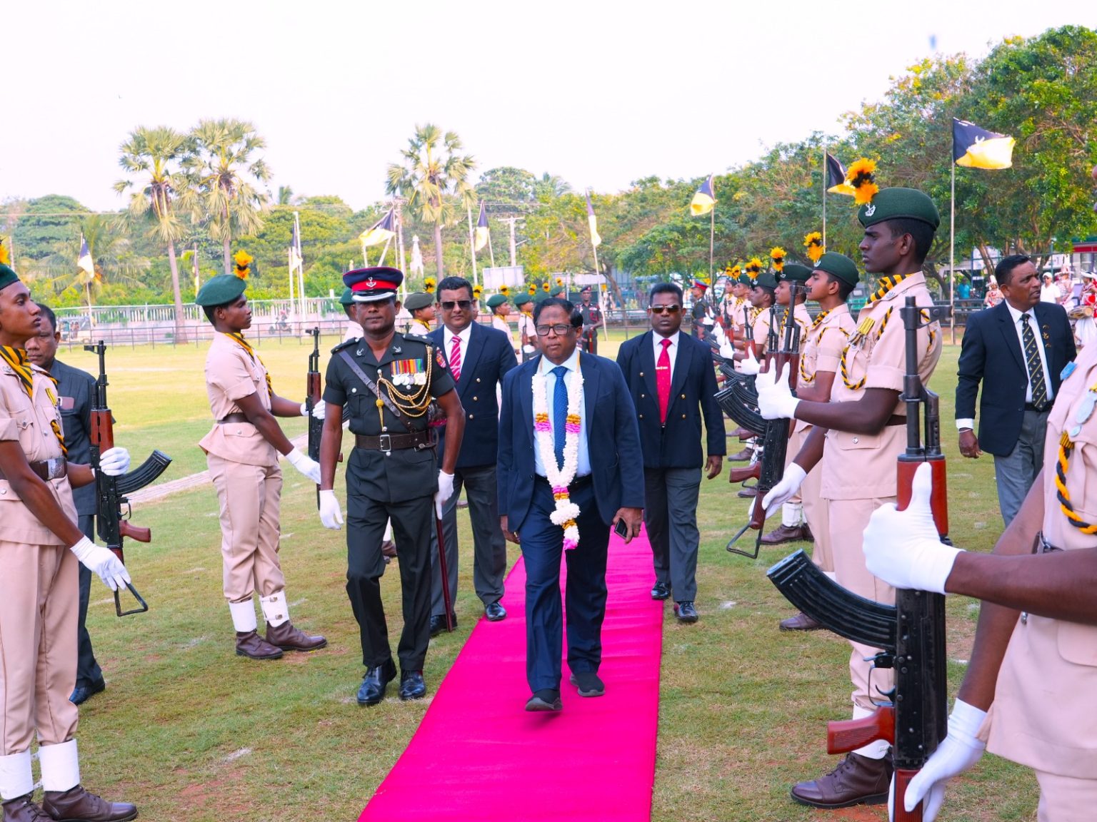 விளையாட்டரங்குக்கு வருகை தந்த ஆளுநரை, தேசிய மாணவர் படையணியின் அதிகாரிகள் சம்பிரதாயபூர்வமாக வரவேற்றனர். அதனைத் தொடர்ந்து அணிவகுப்பு மரியாதையை ஆளுநர் பார்வையிட்டார்.